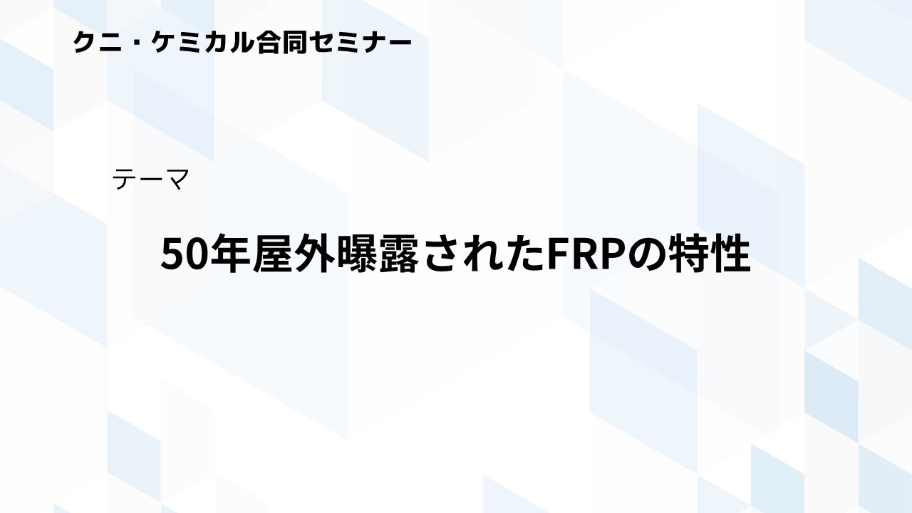 「50年屋外暴露されたFRPの特性」オンラインセミナーをYou Tube公開 2023 2/17 お知らせ 新着記事 2023年2月17日 株式会社クニ・ケミカル主催のオンラインセミナーに登壇させていただきました。 「50年屋外暴露されたFRPの特性」の詳しい内容は当社技術レポートをご覧ください。⇒コチラ お知らせ 新着記事 #FRP技術紹介 #FRP改修 #技術相談 #frp #技術評価受託 #研究開発 #設計 よかったらシェアしてね! URLをコピーしました! URLをコピーしました! 一般複合容器(FRP高圧タンク)の廃棄スキーム開発 塩酸貯槽天板部切替工事 この記事を書いた人 frpkaji 関連記事 本社WEBサイト リニューアル 2026年3月31日 FRPのクラック・膨れ・層間はく離:止まって見えても進行することがある 2026年3月14日 FRPの白化・チョーキングは危険サイン?相談前に見る3点 2026年2月13日 FRP劣化診断のご相談について(お問い合わせフォーム/お電話の受付案内) 2026年2月12日 2026年 年頭の挨拶と目標 2026年1月1日 FRPカジ公式YouTubeでショート動画配信スタート! 2025年12月16日 【新連載】若手が学ぶ!FRPカジの技術レポート徹底解説(11月スタート) 2025年10月31日 微細ガラス繊維に要注意、身近な“FRP”でも安全第一 2025年9月29日