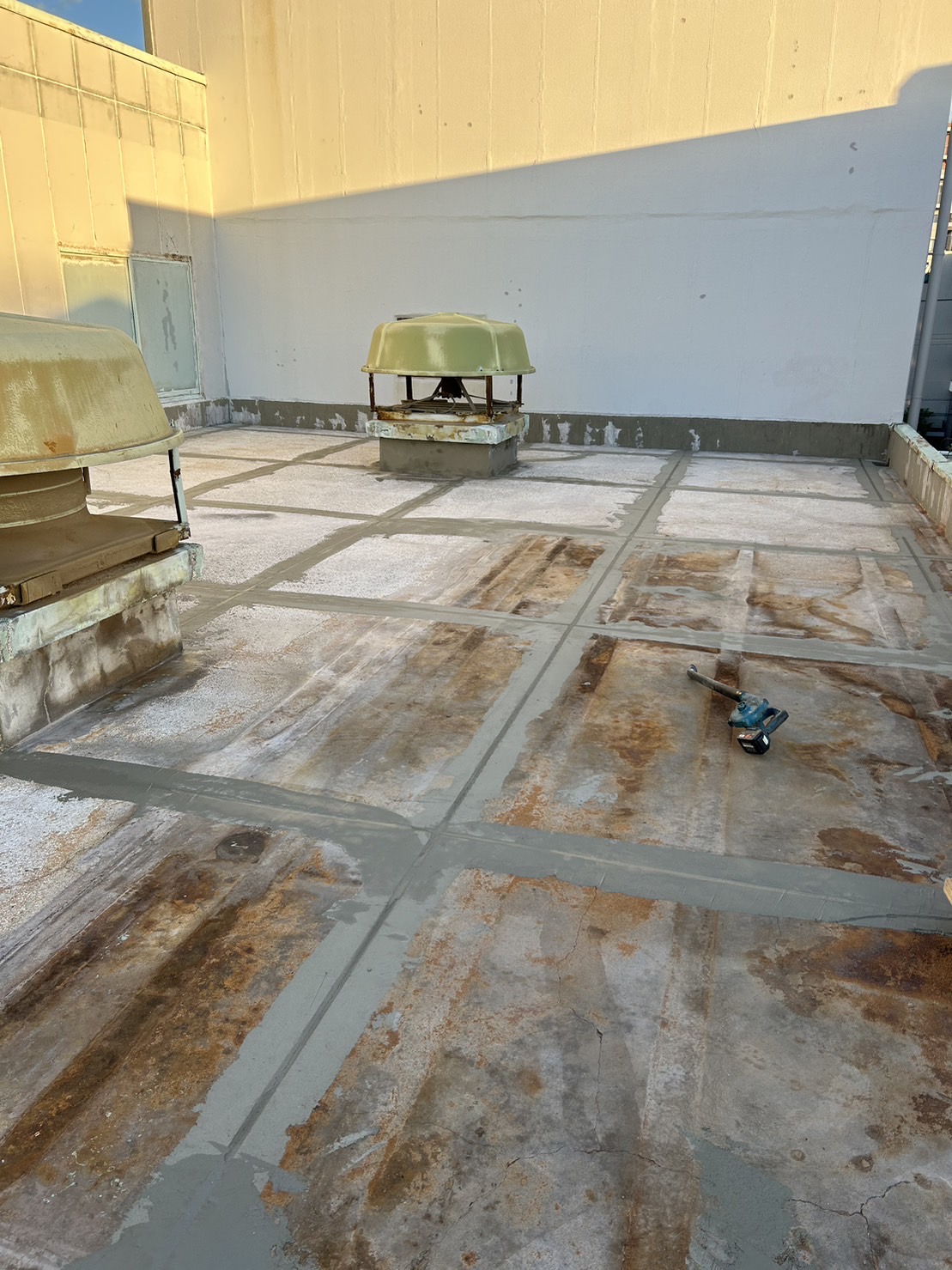 塩酸から発生する塩化水素により工場屋上全体が腐食したとの技術相談をいただき、簡易的な環境測定を実施して設計要件を構築し、工場屋上のFRP通気緩衝工法による耐塩化水素対応の防水工事施工実施しました。