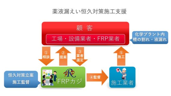 「FRPで薬液漏れを食い止める」 当社の薬液漏えい恒久対策施工支援事業のスローガンです。 薬品を使用する化学プラント工場などでは多くの耐薬品性FRP機器(タンク類、ダクト、カバー等)を使用していますが、設計や製作ミスにより薬液漏洩などが引...