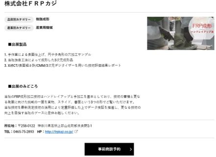 テクニカルショウヨコハマでの事前商談予約ページが公開となりました。 お客様の課題や要望を理解し、的確なご提案をさせていただくためには、面と向かっての商談が必要と考えております。 FRPに関する設計、成形加工、塗装、改修等で課題を感じている方やFRP廃棄物処理に関することなど、 是非この機会に事前商談をご検討ください。 -